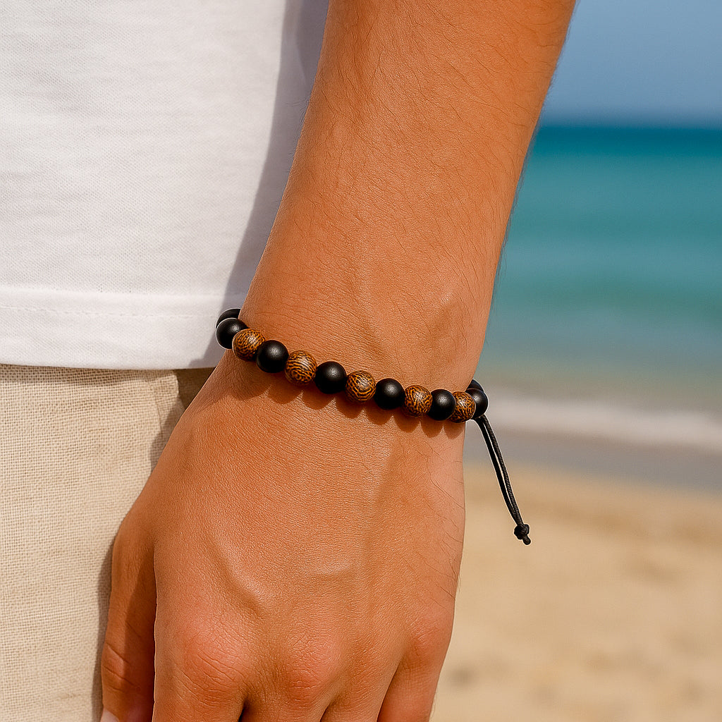 Confeccionada con la rica madera de ébano y la oscura madera de wengué, esta pulsera es mucho más que un accesorio: es una auténtica obra de arte que captura la magia y el encanto de uno de los destinos más fascinantes del mundo.