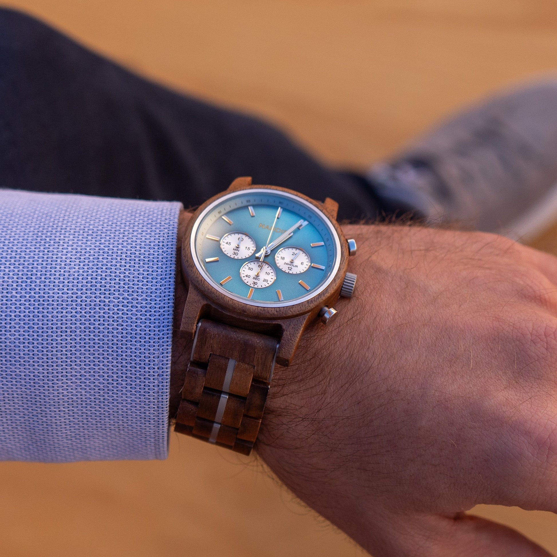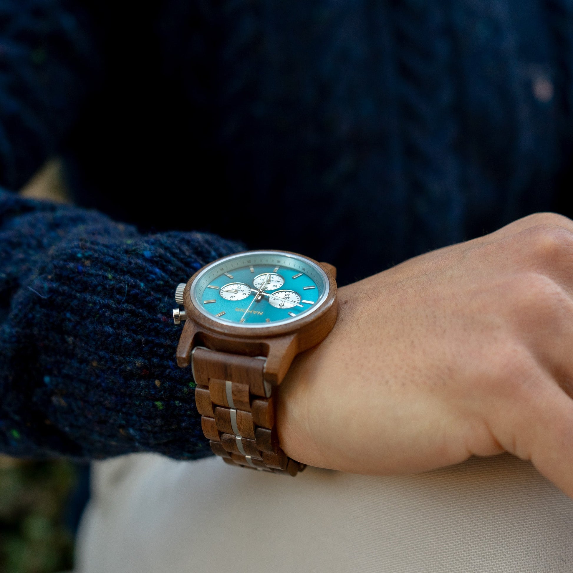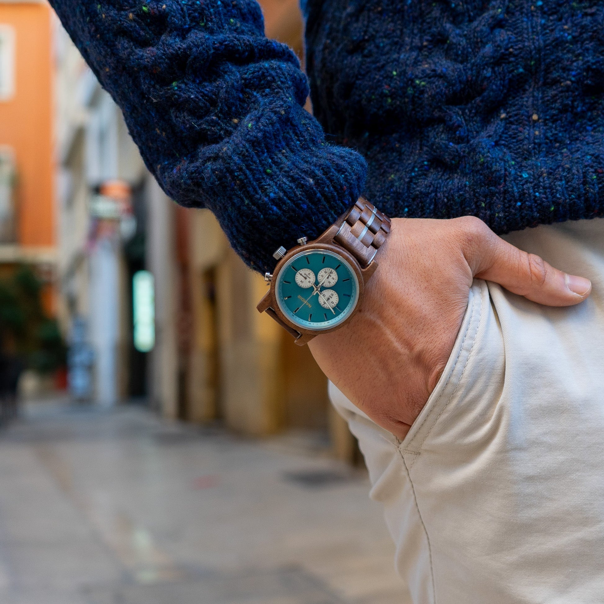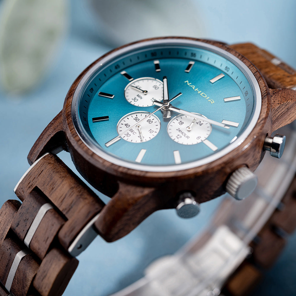 El Nevada es un reloj artesanal hecho con madera de nogal, cuidadosamente seleccionado por su textura cálida y su tono profundo. Una pieza que destaca sin esfuerzo, perfecta para almas libres que saben que el verdadero lujo está en los detalles.